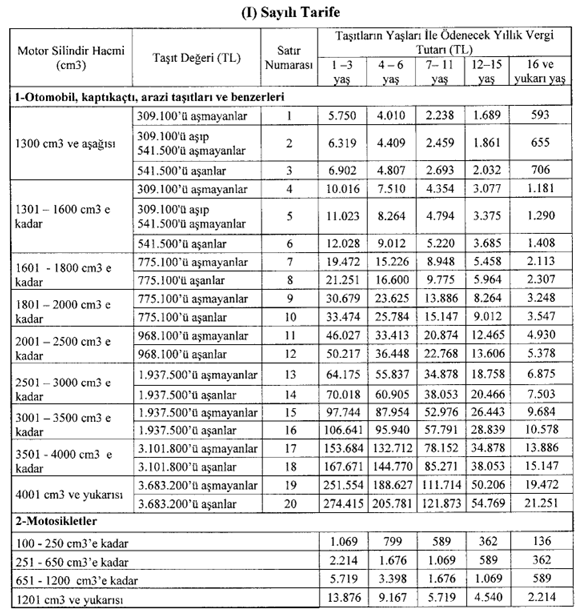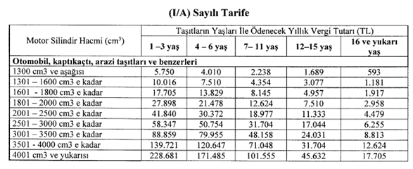 A. (I) Sayılı Motorlu Taşıtlar Vergisi Tarifesi
