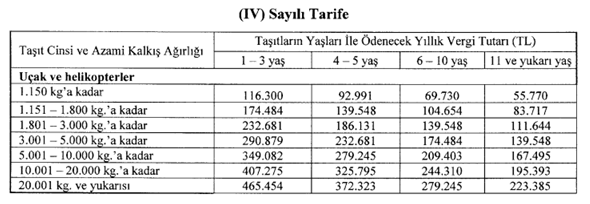 Uçak ve helikopterler (Türkkuşu, Türk Hava Kurumuna ait olanlar hariç) aşağıdaki (IV) sayılı tarifeye göre vergilendirilir.